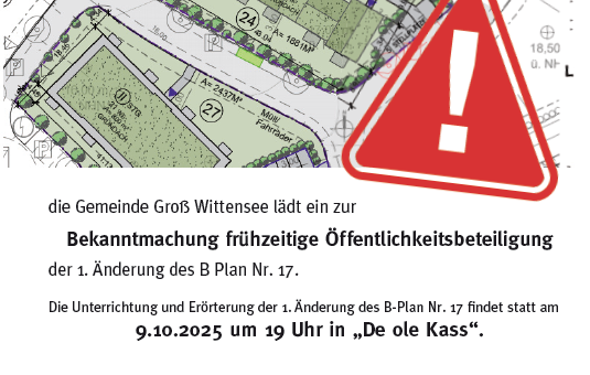 Die Gemeinde Groß Wittensee lädt ein zur Bekanntmachung frühzeitige Öffentlichkeitsbeteiligung der 1. Änderung des B Plan Nr. 17. Bei der 1. Änderung geht es um die drastische Erhöhung der Wohneinheiten in den geplanten Mehrfamilienhäusern auf den Grundstücken Nr. 24 und 27 des B Plan Nr. 17. Anstatt 12 Wohnungen auf beiden Grundstücken, sollen nun alleine…